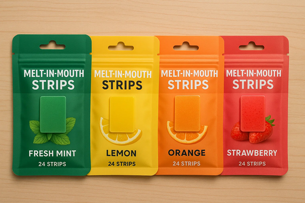 Successful Vitamin ODFs optimize four pillars: film base, loading strategy, palatability, and stability. The film base uses clear, flexible hydrophilic polymers and plasticizers (e.g., glycerin, propylene glycol) to balance mechanical strength with rapid disintegration; process parameters—solid content, coating weight, drying temperature/airflow/time—are tuned to achieve a typical 60–120 μm thickness for comfortable mouthfeel and adequate loading. Loading examples include Vitamin C (30–100 mg/strip), Vitamin D3 (10–25 μg/strip ≈ 400–1000 IU), and Vitamin B12 (250–1000 μg/strip); microencapsulation or solid dispersions can be applied to improve taste, dissolution, and stability when needed. Palatability goes beyond sweetness: acidic-sweet balance, flavor layering, and mucosa comfort (cooling or light after-taste) deliver a “fast-melt, non-sticky” experience. Stability is safeguarded by controlling residual moisture at 2–6%, plus light and oxygen barriers—especially critical for D3. High-barrier sachets or blisters are recommended. ICH-style accelerated and long-term studies verify appearance, assay, disintegration, and microbiology. The platform supports OTC/nutrition channels, cross-border e-commerce, and retail labeling with batch traceability. Throughout the page, SEO terms like “oral dissolving film,” “oral thin film,” and “vitamin ODF” are woven in to capture relevant searches while maintaining scientific accuracy.